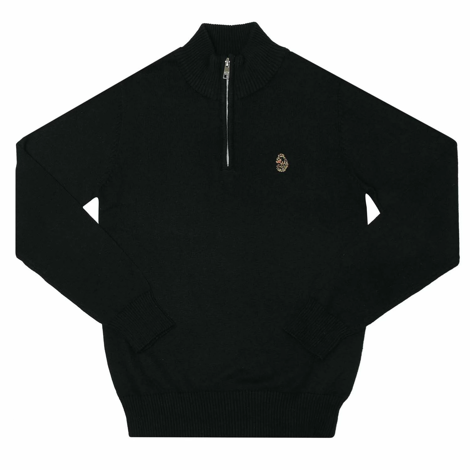 Junior Boys Luke 1977 Pretender ¼ Zip Jumper in black.- High neck collar.- Long sleeves.- 1-4 zip fastening.- Ribbed cuffs and hem.- Embroidered branding.- 100% Cotton. Machine washable. – Ref:M350612JK