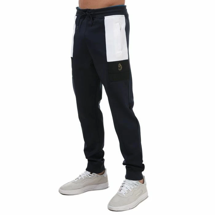 Mens Luke 1977 Cosmos Colour Block Jog Pants in navy.- Elasticated waist with drawcord.- Colour block cut and sew detail on legs.- Luke lion embroidery on left leg.- Two front zipped pockets.- Back pocket with zip.- Ribbed waistband and cuffs.- Regular fit.- 94% Polyester 6% Elastane. Machine washable. – Ref: M530305NAVY