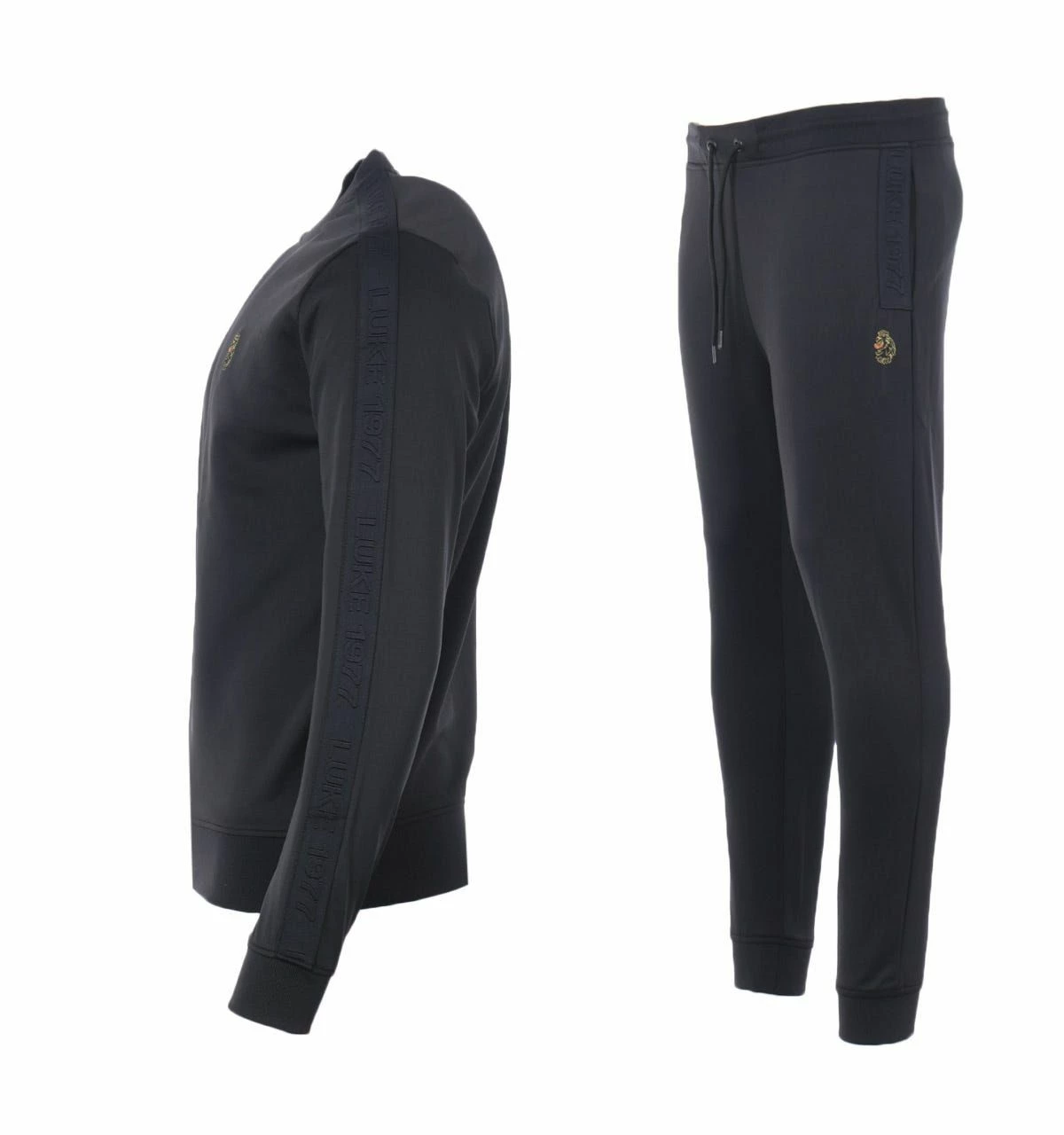 M470340SETBLKMens Trico TracksuitMens Luke 1977 Trico Tracksuit in black. – Sweatshirt:- Crew neck.- Ribbed trims.- Luke 1977 raised text tape detailing at the sleeve.- Luke lion embroidery on chest.- 94% Polyester 6% Elastane. Machine washable.- Pants:- Drawstring waist.- Ribbed cuffs.- Two front pockets. One back pocket.- Branded taping at slit pockets.- Luke 1977 logo embroidered at left thigh.- Regular Fit.- 94% Polyester 6% Elastane. – Ref: M470340SETBLK