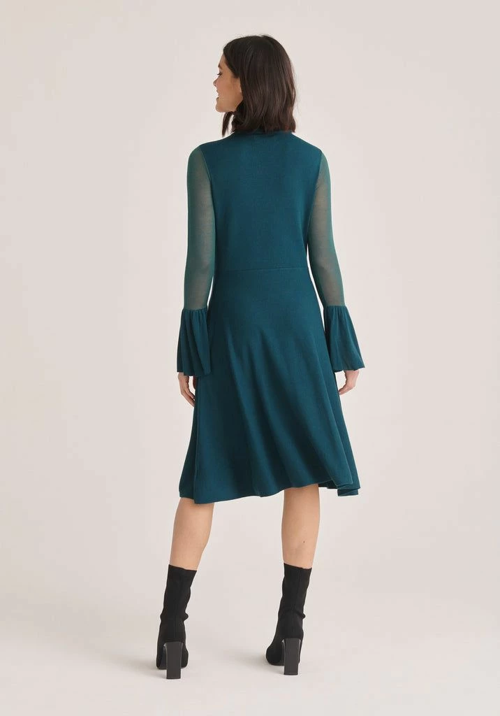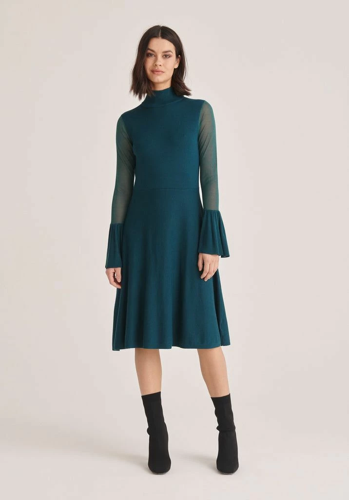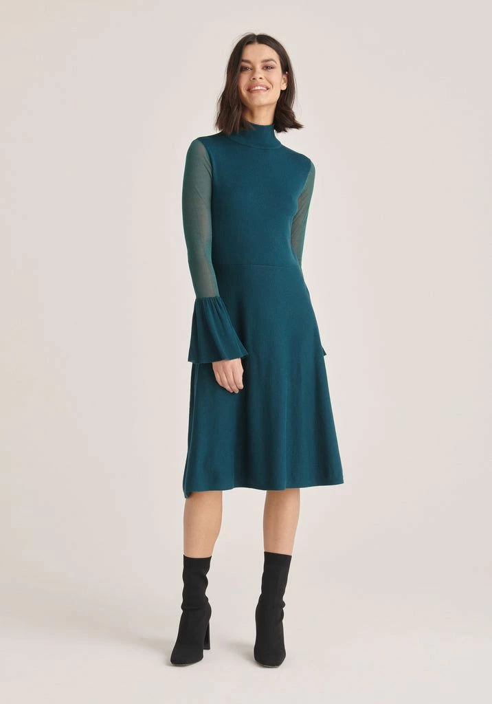 This skater style dress is one of our favourite pieces for this winter. Made from a soft stretchy yarn, it features a high neckline and flared sheer sleeves for both warmth and style. This knitted dress will look the best with ankle boots or heels.