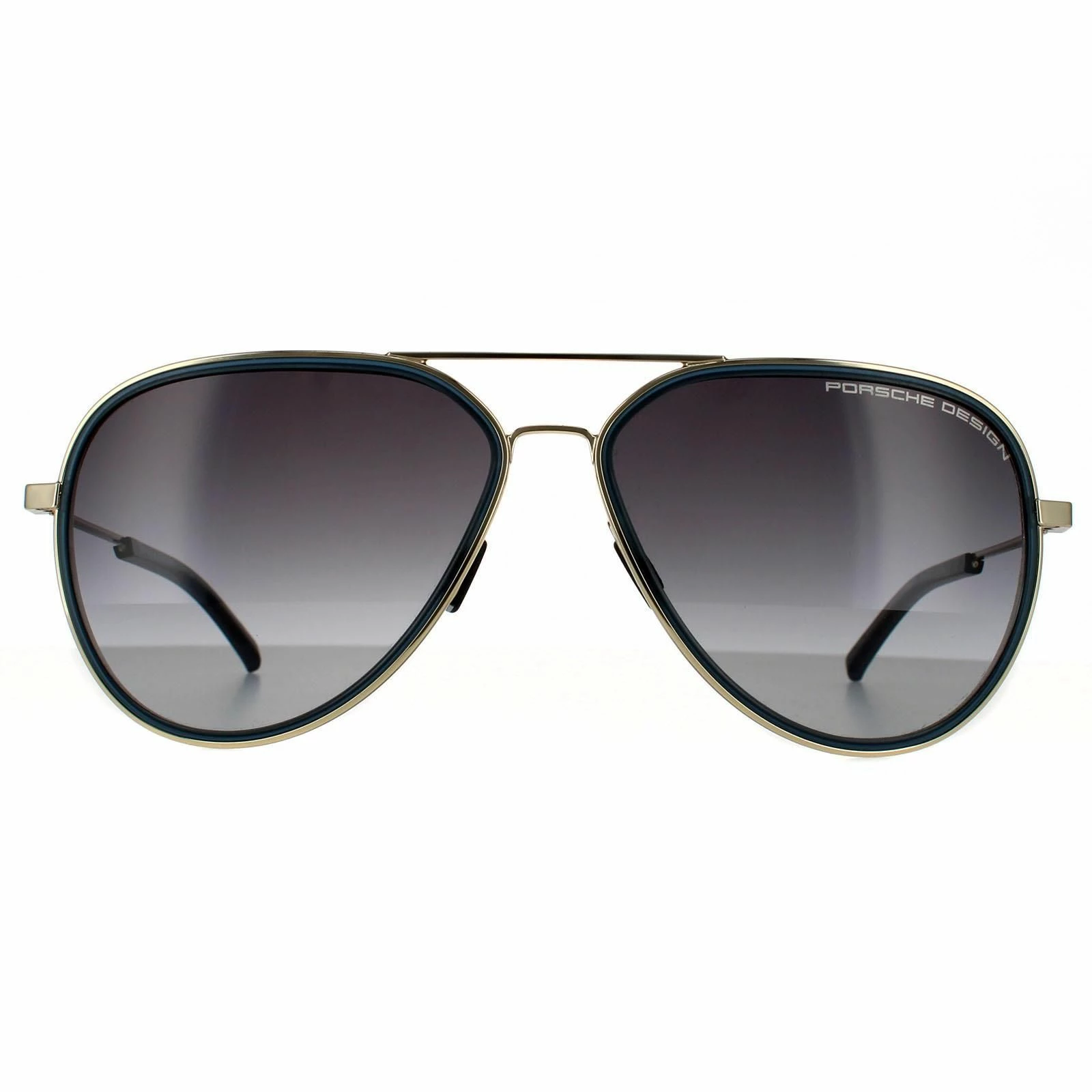 Porsche Design Aviator Mens Gold Grey Gradient AR Blue 90041091 Porsche Design are a classy aviator style crafted from lightweight plastic. The adjustible nose pads, slim top brow bar and plastic temple tips ensure all day comfort. The Porsche logo is engraved into the slim temples.