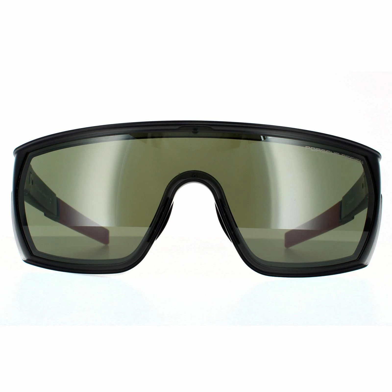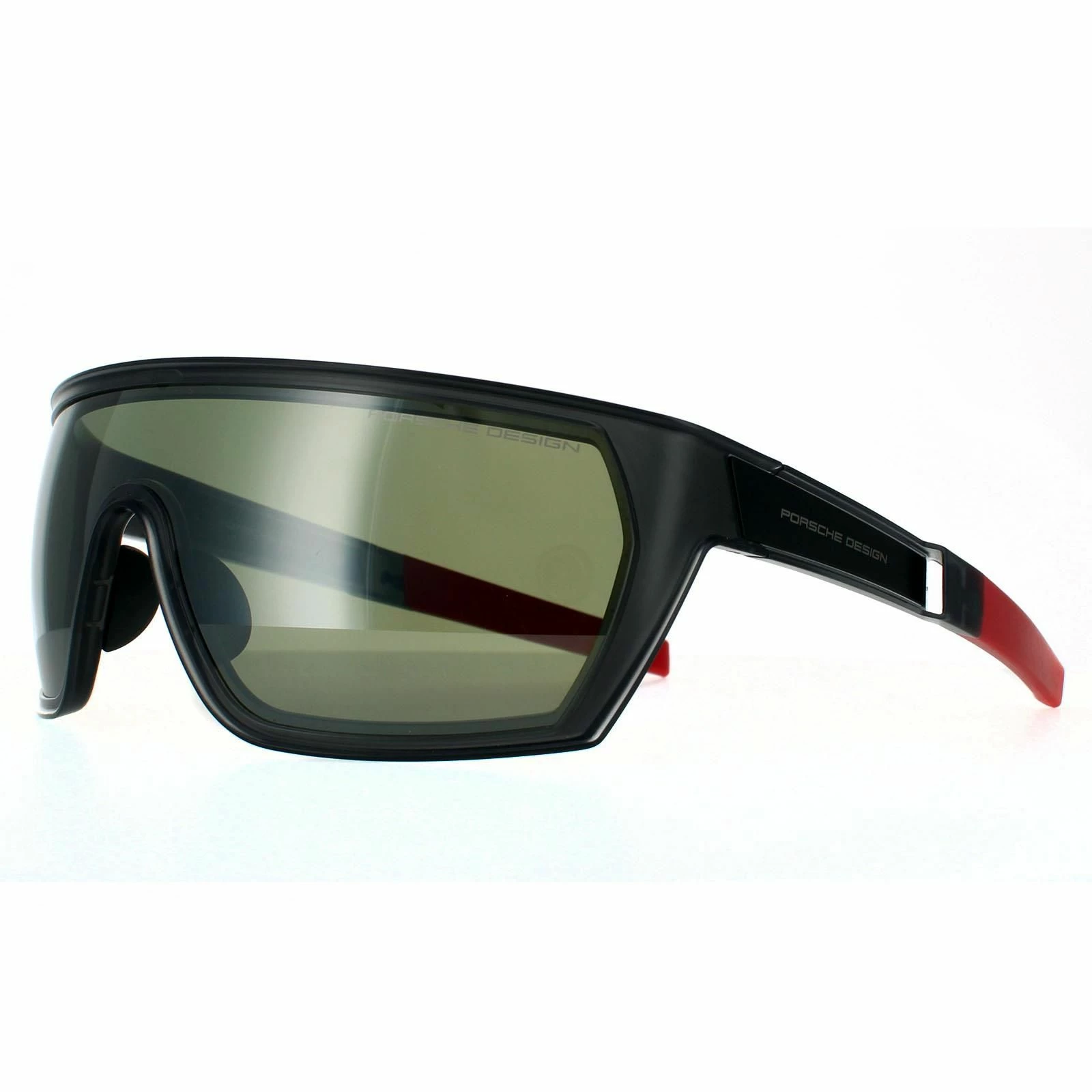Porsche Design Shield Mens Grey Red Olive Lite Silver Mirror 90041091 Porsche Design are a modern shield style crafted from lightweight acetate. The slender temples are engraved with the Porsche Design for brand authenticty.
